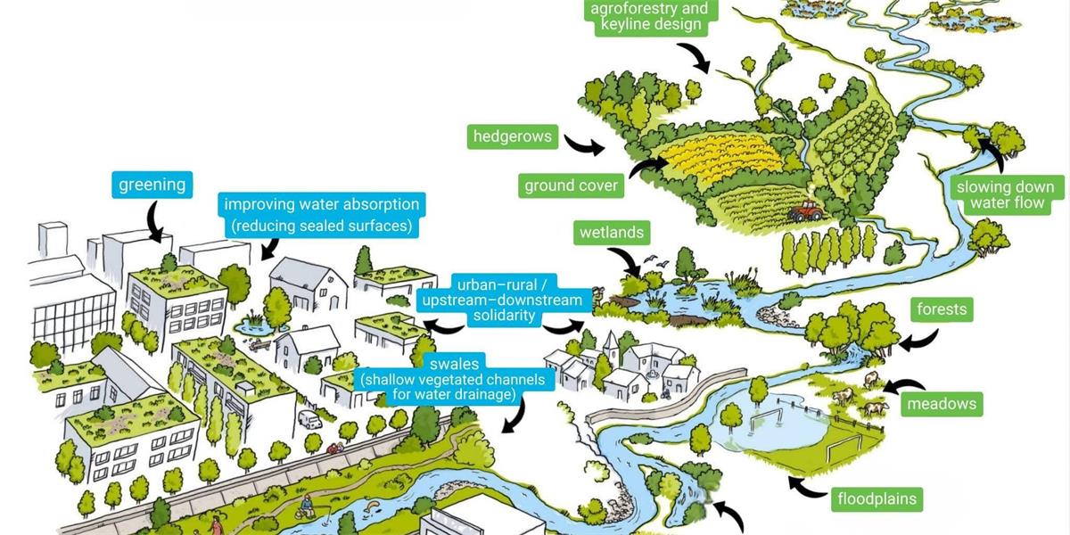 This illustration from Géoconfluences (Alexis Pernet, 2023) captures a different vision. It shows how every part of a territory, from the rooftop to the river delta, can play a role in slowing water down.