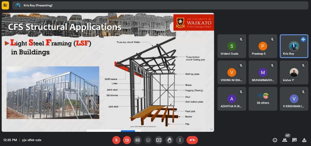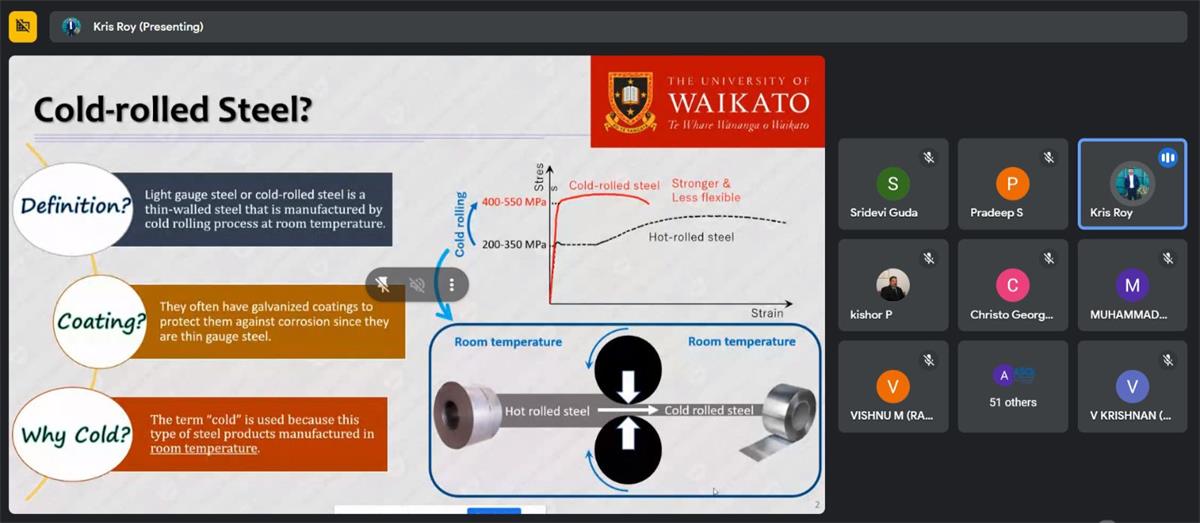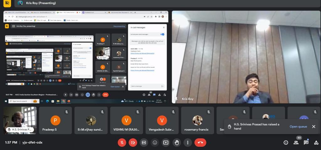 The Professional Talk on "Application of Cold-Formed Steel in the Construction Industry" was held on August 19, 2023, from 12:00 PM to 2:00 PM (IST) was organized by American Society of Civil Engineers (ASCE) India Section Southern Region. The Welcome Address was given by Dr.Guda Sridevi, Secretary, ASCE IS SR, Mr.S,Pradeep, President, ASCE IS SR introduced and felicitated the Chief Guest. The event featured a presentation by Dr. Krishanu Roy, a distinguished expert and Senior Lecturer in Civil Engineering at the School of Engineering, University of Waikato, Hamilton, New Zealand. The talk aimed to shed light on the innovative applications of cold-formed steel in the construction sector and was attended by participants from India and around the world. Dr. Kishor Pankan, Treasurer, ASCE IS SR presented the Vote of Thanks at the end of session.
