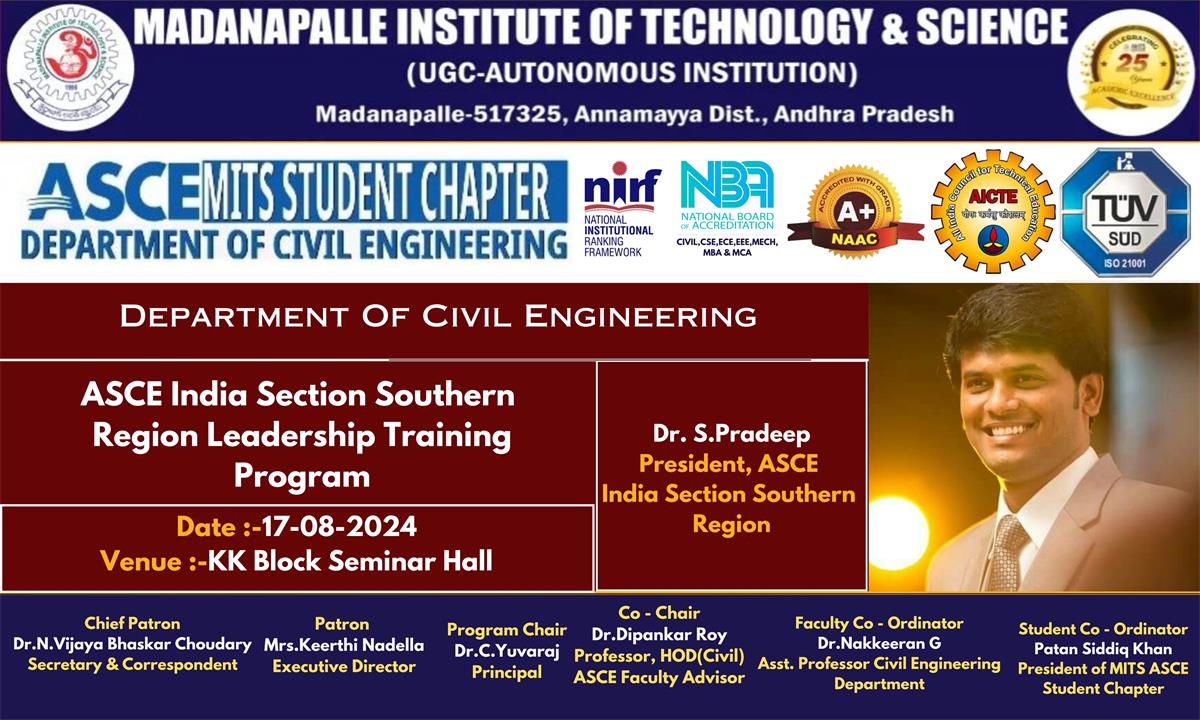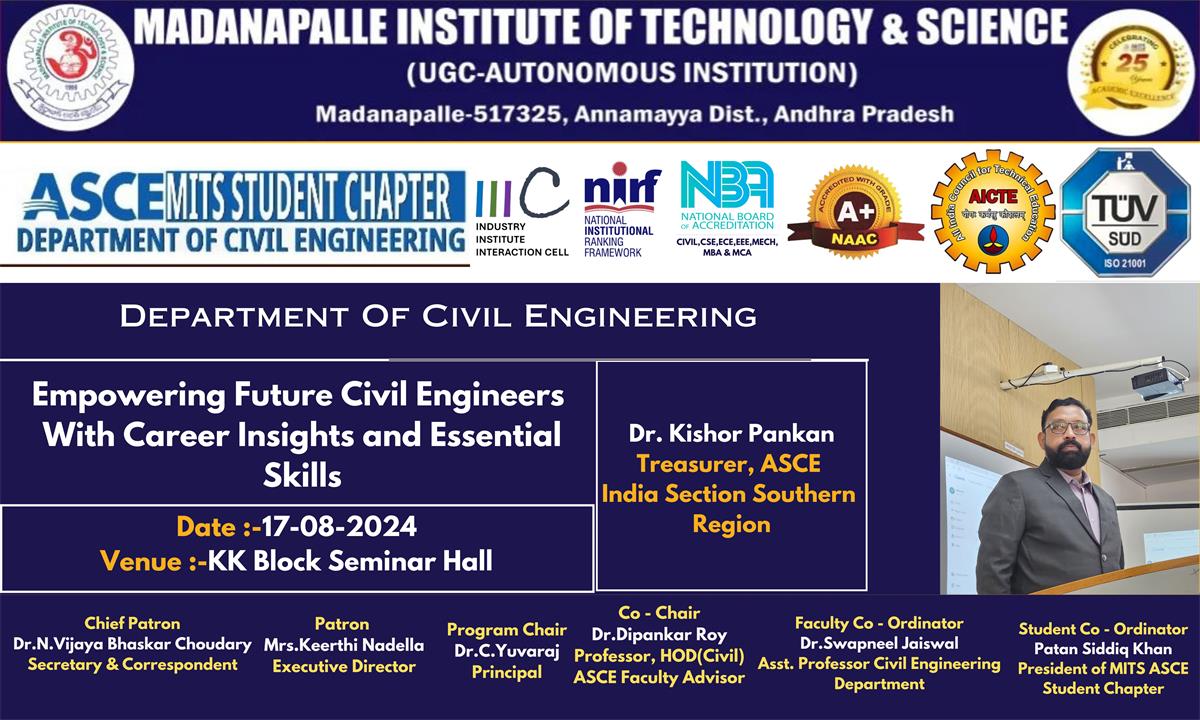 MITS Civil Engineering Department has started ASCE Student chapter in 2023 and conducting numerous events every year. Primary focus of these programs is to develop students to be true civil engineering professionals, bridge the gap between industry and academia, connect and collaborate with other ASCE student chapters world wide. The chapter is entirely run and managed by students. Leaders of the chapters along with their team members are doing excellent job in planning and executing various events. ASCE IS SR leadership visited MITS chapter and guided our students on how to take the chapter to a global stage, connect with industry experts all over the world.