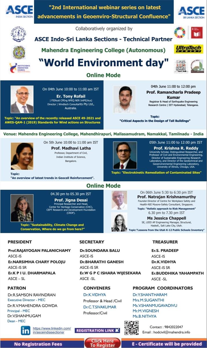 We are cordially invite you at the "2nd International Webinar Series on latest advancements in GeoEnviro-Structural Confluence" Collaboratively organized by ASCE Indo-SriLanka Sections, Technical Partner as Mahendra Engineering College (A) Namakkal to be held on World Environment Day Celebrations during 04th June 2022 (Online Mode 9:50 am to 12:10 pm IST), 05th June 2022 (Physical Mode 9:45 am to 12:15 pm IST) & 06th June 2022 (Online Mode 4:20 pm to 7:40 pm IST)