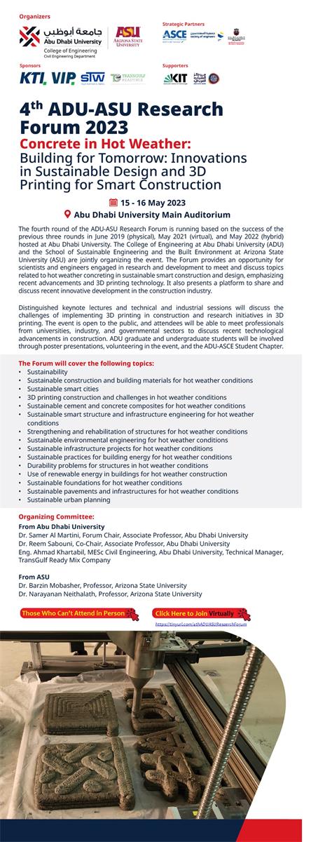 Dear, UAE Section, You are invited to attend the 4th ADU ASU Research Forum on the 15th and 16th of May 2023. The theme of this forum is Concrete in Hot Weather: Building for Tomorrow: Innovations in Sustainable Design and 3D Printing for Smart construction. This is a hybrid event and is free. If you can attend in-person it will be held at the Abu Dhabi University in the Main Auditorium. If you can join virtually you can do so through this link. https://events.teams.microsoft.com/event/a56a9f11-a7d0-4855-9dd3-13caf1c36a0f@fb25857d-dd82-4cb3-a1df-1903d0c42b21. Global Programs
