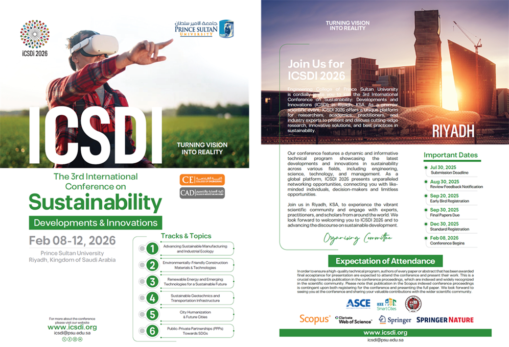 ASCE supported conference, the 3rd International Conference on Sustainability: Developments & Innovations (ICSDI 2026) will be held at Prince Sultan University, Riyadh, 8 – 12 February 2026.