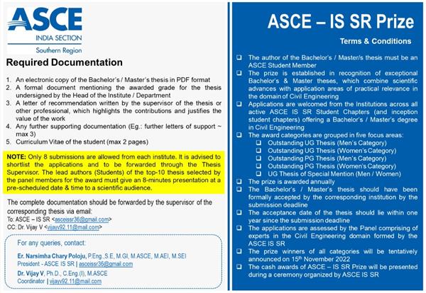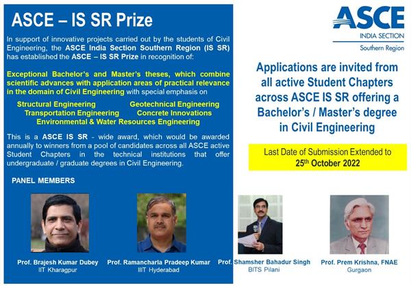 In continuation to 6th Sep 2022 email, ASCE IS Collaborate Announcement and With reference to Past, Present IS Presidents and Panel Members (Reviewers) valuable inputs on the above said subject, On behalf of ASCE IS SR & ASCE Region10 BoG Corr. Member, This is to convey you that applications submission date is extended to 25th oct 2022 upon requests from couple of student chapters HoD's & Faculty Advisor's. Once again I am requesting and Inviting you all ASCE IS SR 2022 Students Members for Best Thesis awards for Undergraduate & Graduate Students and also sharing with you the below part of Board of Direction Strategic Process Plan follow up email, Leadership email of Strategic Process plan recorded video and also Latest "Back to School: ASCE Student Chapter Leader Announcements" for your kind perusal.