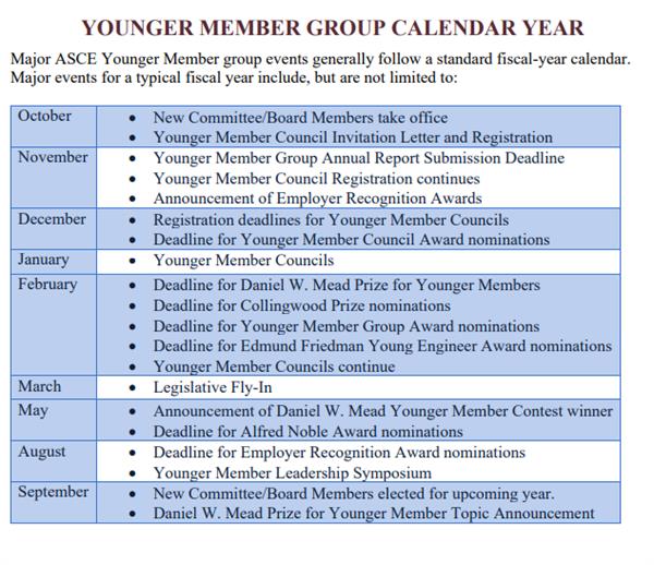 https://www.asce.org/uploadedFiles/Membership_and_Communities/Younger_Members/Content_Pieces/ymg-handbook-2017.pdf As I am a new YMG president, my favorite part is the group calendar year as it gives me an idea of all the deadlines throughout the year. (Disclaimer: this was set up as for a standard fiscal-year which 2020 is definitely not.) Regardless if you are the president of your group, I think this is an excellent and informative read for any Younger Member!