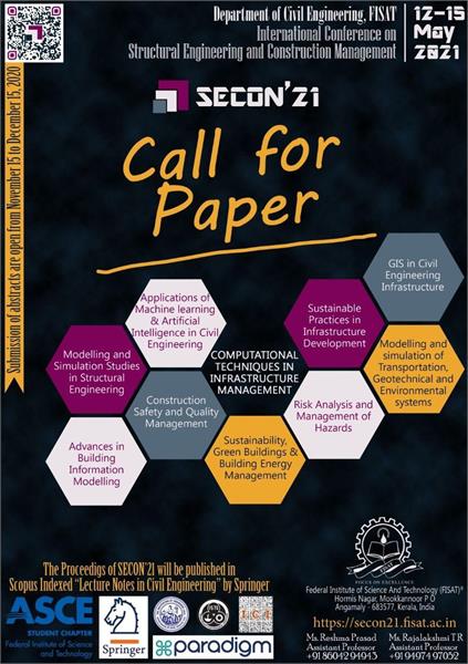 Department of Civil Engineering, Federal Institute of Science and Technology (FISAT), Ernakulam, Kerala, India, proudly announces the Annual International Conference SECON'21 in association with American Society of Civil Engineers Student Chapter FISAT, paradigm IT Private Limited, ICI , IEI - Kochi local centre, and Indian Society for Technical Education to be held from 12th to 15th of May 2021.