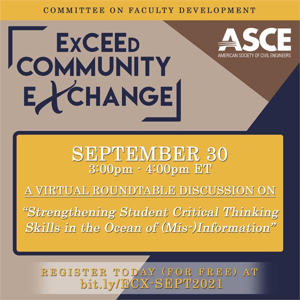 The first ECX of Fall 2021 is scheduled for September 30th, 2021, 3:00 – 4:00 pm ET, which will be a roundtable discussion on Strengthening Student Critical Thinking Skills in the Ocean of (Mis-)Information. CFD invites you to join and contribute toward a roundtable discussion on how civil engineering faculty have developed teaching practices that help students navigate the overwhelming amount of information available at their fingertips. How are engineering faculty equipping students with the necessary critical thinking skills to realize what is salient information for civil engineering design from what is not? Join the discussion, exchange ideas, and learn from others at the ExCEEd Community Exchange (ECX)!