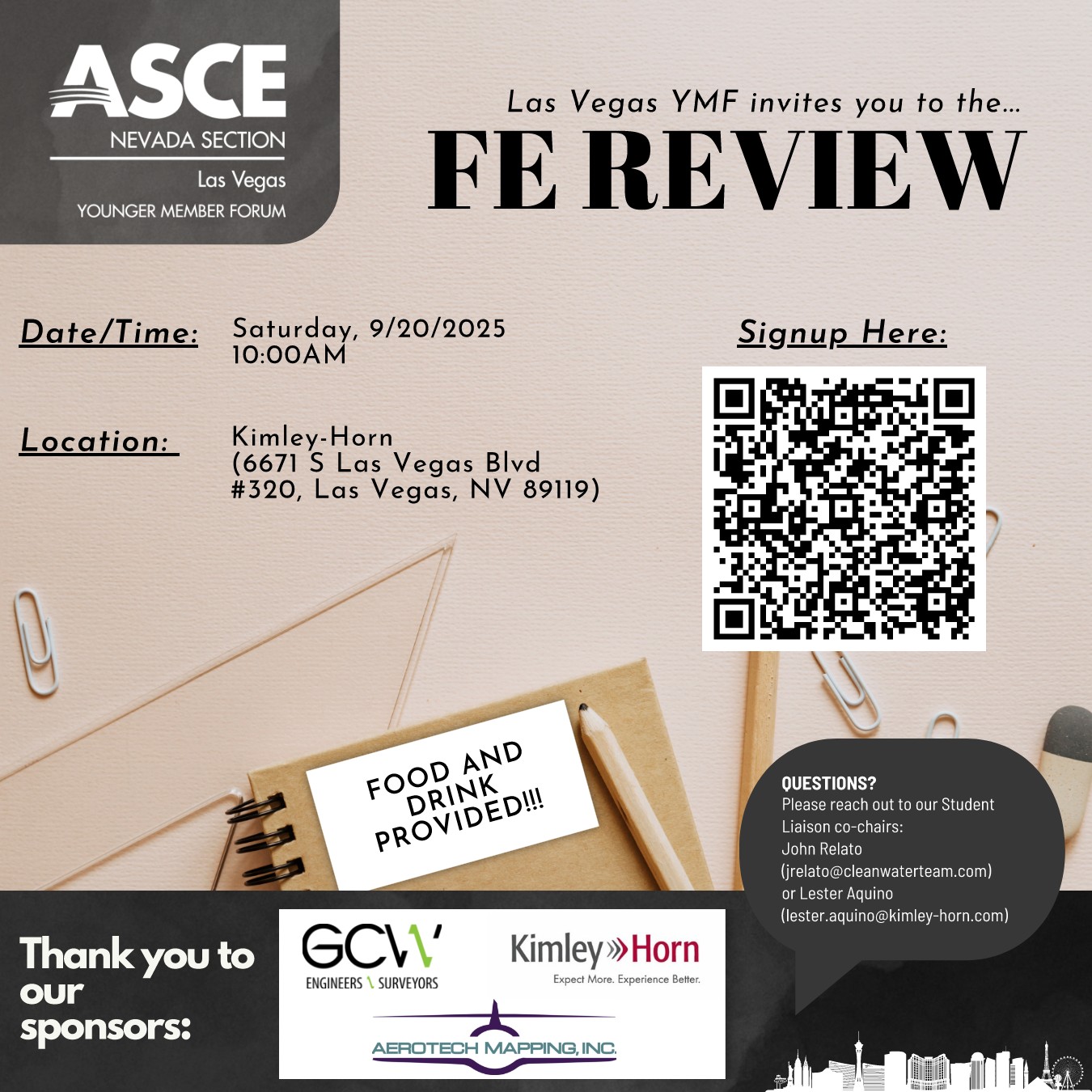 Get ready to sharpen your skills for the FE Exam! Join us on Saturday, September 20, 2025, at 10:00 AM at Kimley-Horn (6671 S Las Vegas Blvd, Suite 320, Las Vegas, NV 89119).
