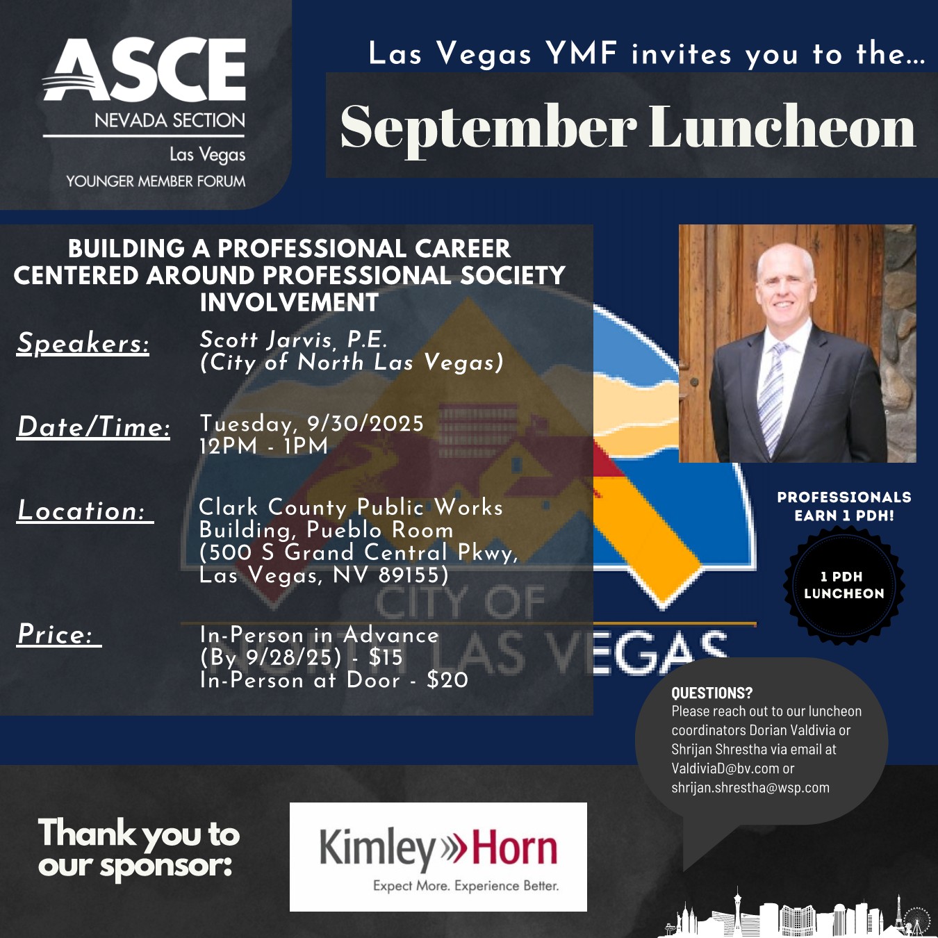 ASCE Las Vegas YMF invites you to our upcoming luncheon featuring Scott Jarvis, P.E. (City of North Las Vegas), as he shares insights on “Building a Professional Career Centered Around Professional Society Involvement.”