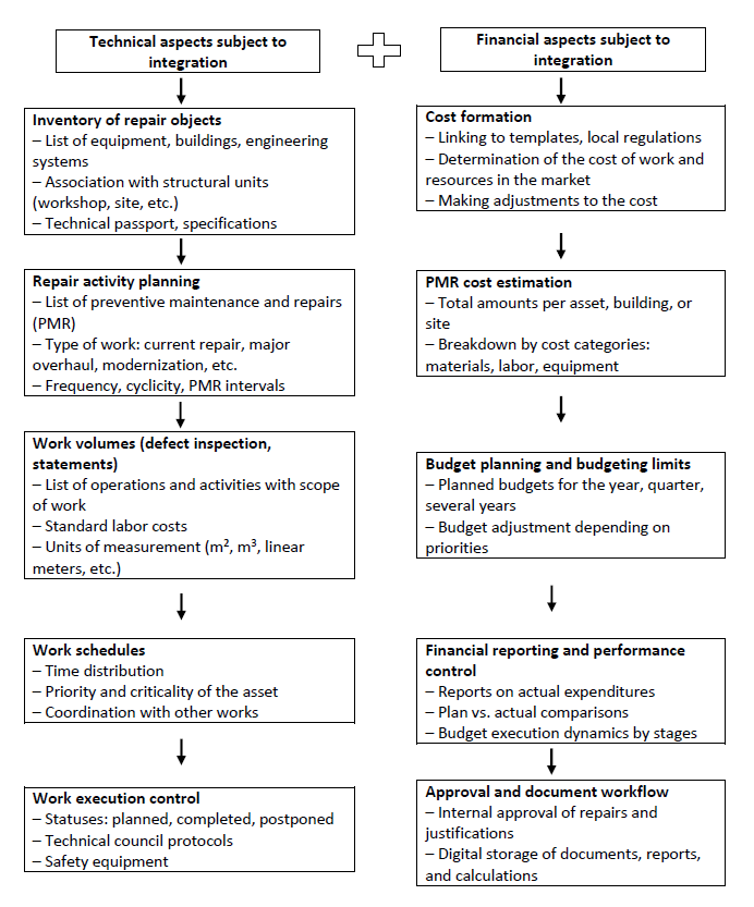 The illustration shows the concept of a unified platform for planning and managing preventive and capital repairs, where technical and financial aspects are connected into a single system.