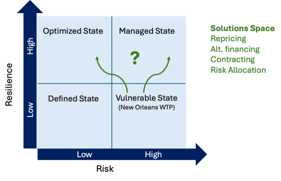 In the context of the risk-resilience 2x2 diagram, the implications are whether and how current infrastructure assets in the lower two quadrants could be 'hardened' and rendered less vulnerable to hazards, towards an optimized or managed state of higher resilience at its current or a lower risk profile. The solutions space for these assets thus leverages risk-pricing and revaluing, attracting alternative financing options and explore more right-weighted risk allocation strategies. Risk mitigation should be thought of as an input. Resilience is the desired outcome.